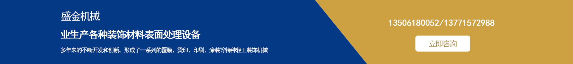 盛金機械專業生產各種裝飾材料表面處理設備 集多年來的不斷開發和創新,形成了一系列的覆膜、燙印、印刷、涂裝等特種輕工裝飾機械。并敢于和善于開發用戶急需的特殊要求機械設備。